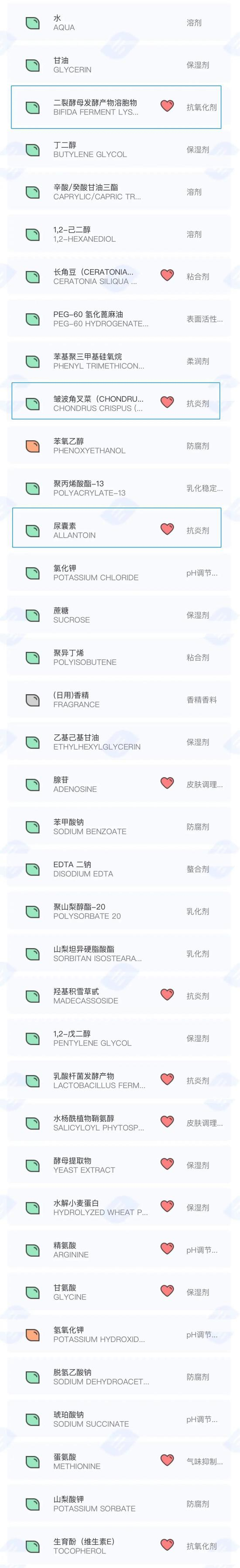面膜里添加了小黑瓶同款成分[二裂酵母发酵产物溶胞物],据说一片面膜含有一瓶小黑瓶精华!(只赚不亏啊)另外还添加了不少舒缓成分,比如尿囊素、腺苷、皱波角叉菜等成分,对于皮肤的修护和急救都非常有效果。
