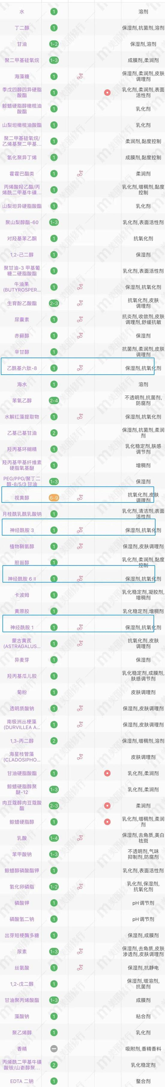 这款面膜添加的是超分子维A醇,比普通的维A醇效果更好,可以促进胶原蛋白提升,另外还有六胜肽作为搭档,双管齐下让肌肤变得水嫩有弹性。面膜中还运用了3:1:1神经酰胺复配,保护皮肤屏障,减少它所收到的刺激,可见珀莱雅在成分上下了不少心血。