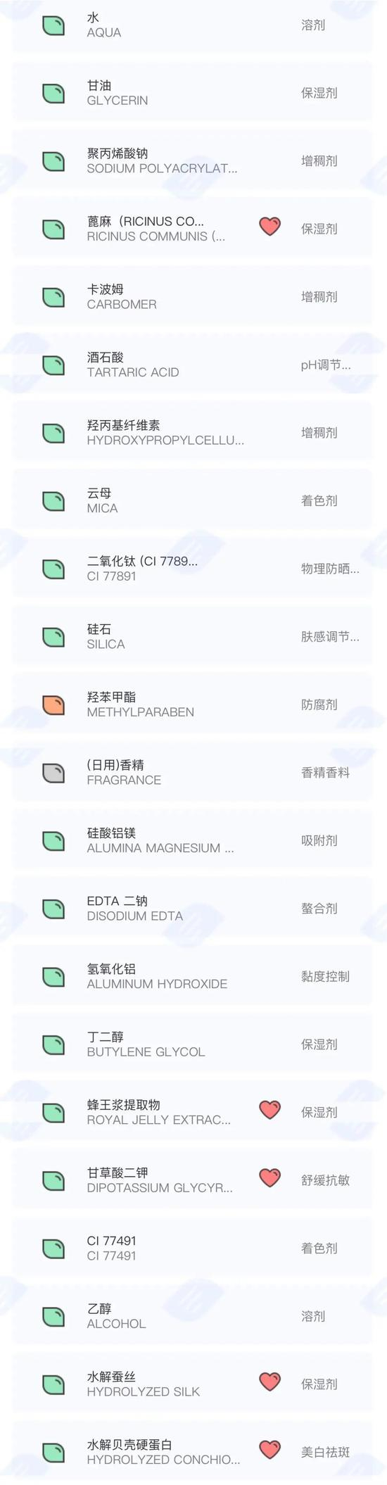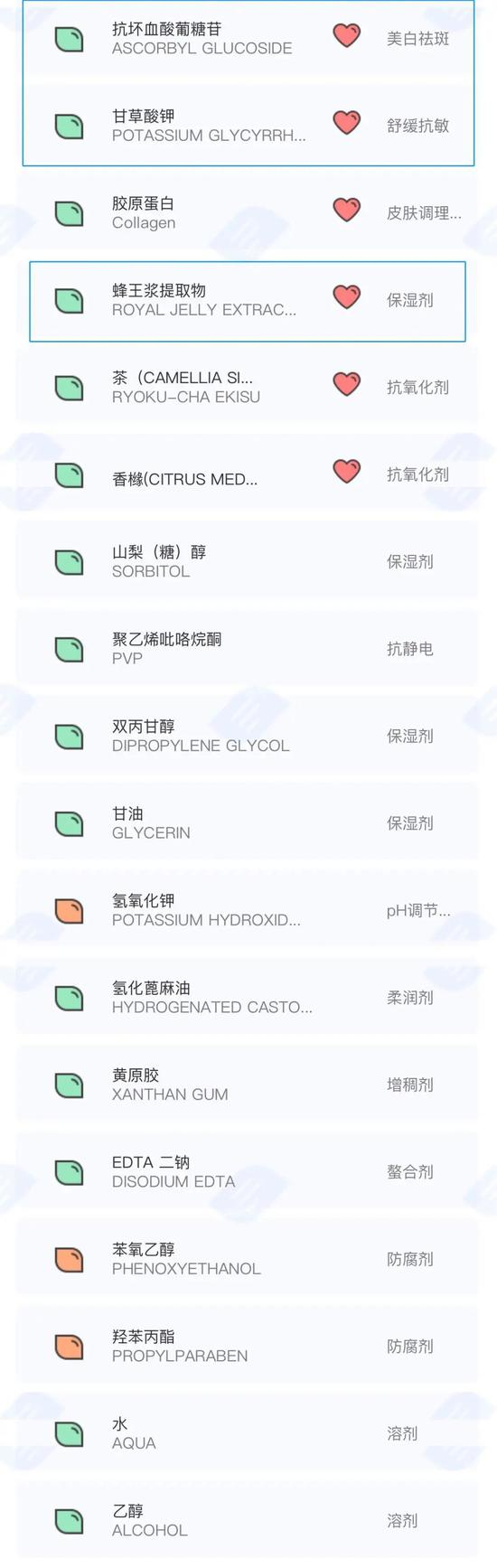 这款面膜添加的是维生素C衍生物,能够一定程度的提亮肤色,赶走暗黄,而且对皮肤的刺激性也比较小,适合大部分人使用。另外还有甘草酸钾和蜂王浆提取物,能够促进皮肤吸收并且保湿,让提亮效果大大增加。