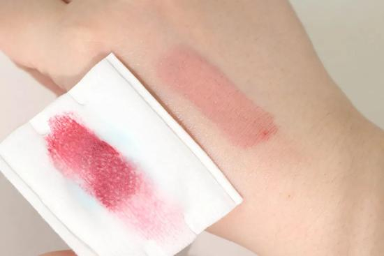 可以看得出来,它的卸妆力度一般,带有染唇效果的唇釉依旧会留下印子。