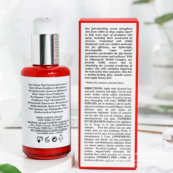 它里面的透明质酸,补水力度超强,用起来有一种在沙漠里找到绿洲的感觉,还有两种植物萃取复合精华,可以延长保湿的时间,吹一整天空调也不担心干燥啦。如果上妆经常卡粉的宝宝,可以试着把这款精华滴两滴在粉底液里,会让粉底变得更滋润~。