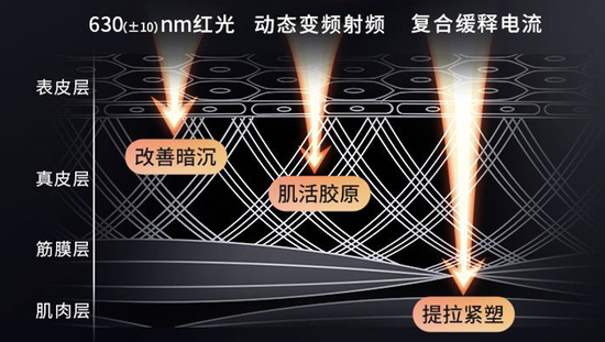 这一款美容仪是专门为亚洲肌肤研发的,联合光、电、热三重能量进入表皮层、真皮层、筋膜层以及肌肉层,从而达到改善肌肤的效果。