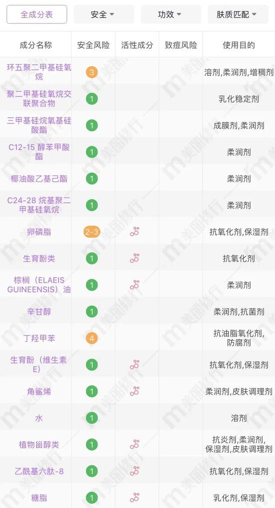 成分中排名前三的都是和硅相关的,丝滑的肤感都是靠它来完成的。棕榈油以及角鲨烷这种油类成分排名靠后,既能修护肌肤,油感还不严重,就连油皮小可爱用起来也丝毫不慌张。