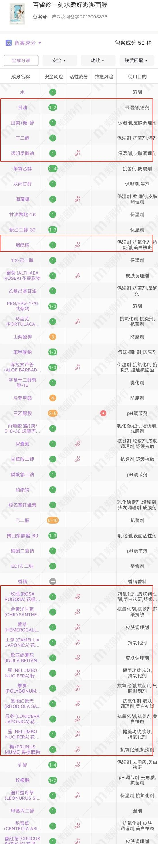 在这款主打保湿的面膜中,KK还惊喜地发现了烟酰胺,具有抗氧化功效的植物提取成分也不在少数,一看就是百雀羚家的“亲闺女”~当然我们不能过于期待含量不高的烟酰胺和植物提取物成分能大幅度提亮肤色,但论优化肤感,绝对算得上是称职啦!