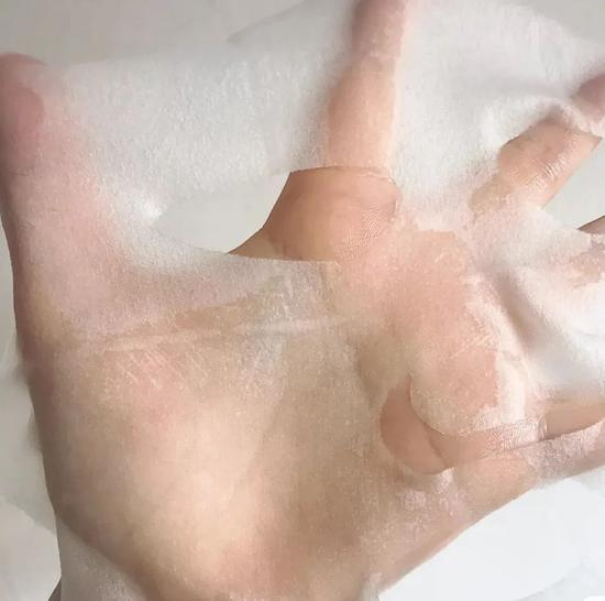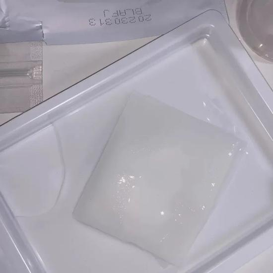 “打开方式”与一般的面膜大不相同,这款面膜拆封后的的确确是“干”的,还配套一个量杯,使用前需要用纯净水浸润膜纸再敷到脸上。