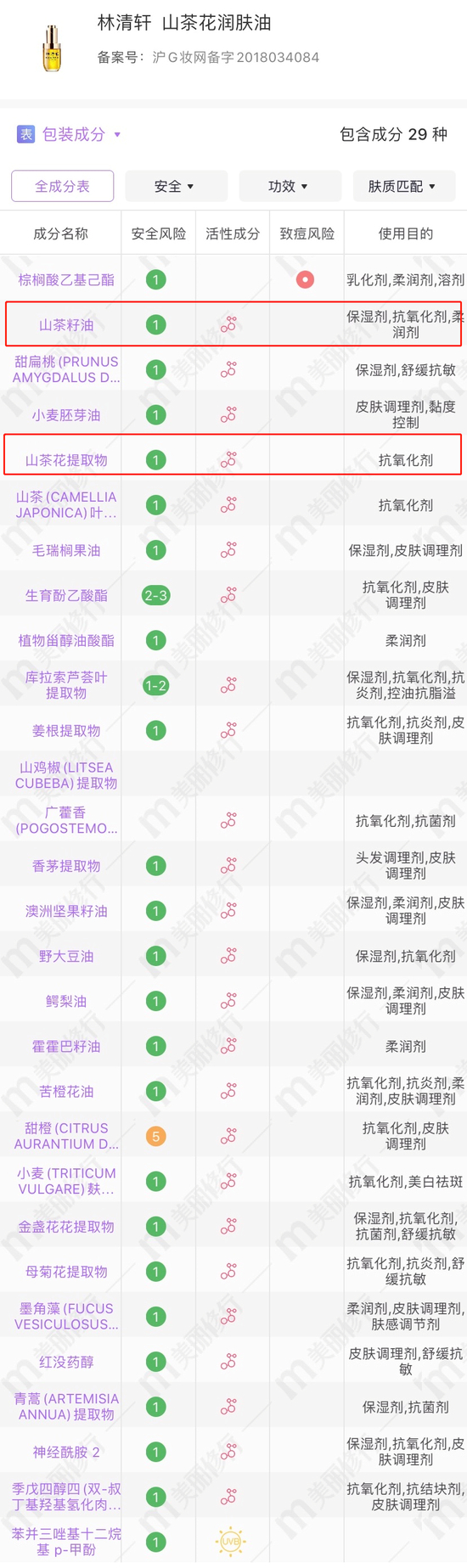 它的优秀功效成分多得KK都看花了眼,即使价格有点点小贵,小编也感觉很值得~润肤油中不仅仅有核心的山茶花籽油成分负责保湿和抗氧化,更蕴含毛瑞榈果油、澳洲坚果籽油等等保湿效果很好的油润成分。金盏花提取物和母菊花提取物起到舒缓作用,也没有添加酒精、香精这样的刺激性成分,小编甚至都可以替干敏肌做主收下这瓶“黄金油”!