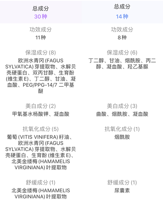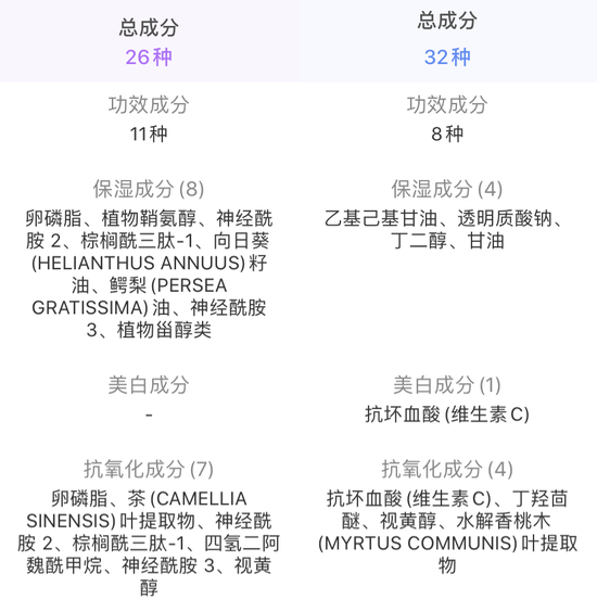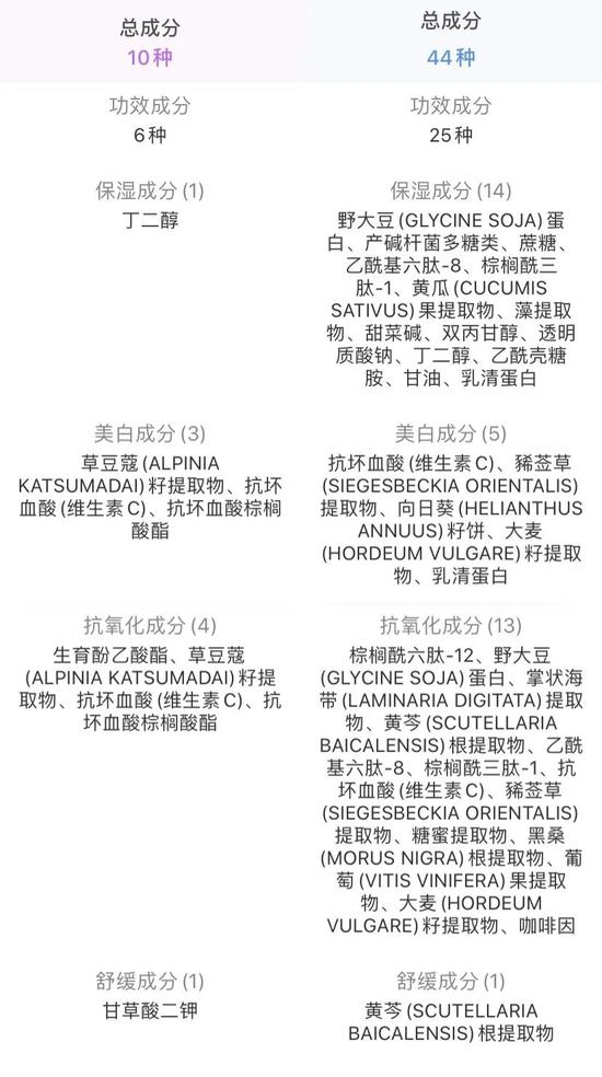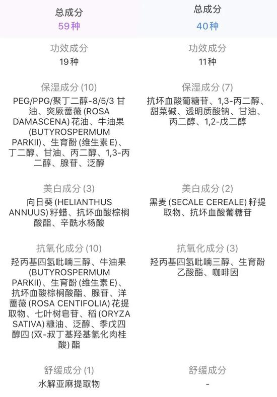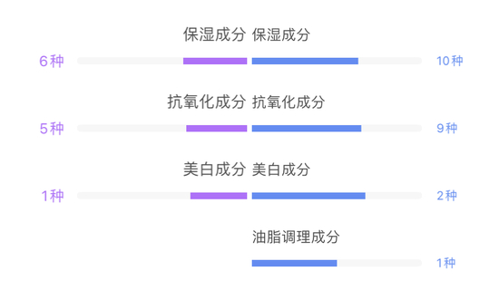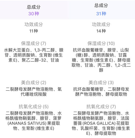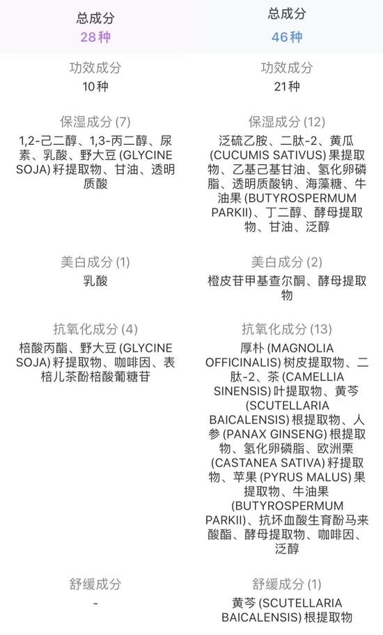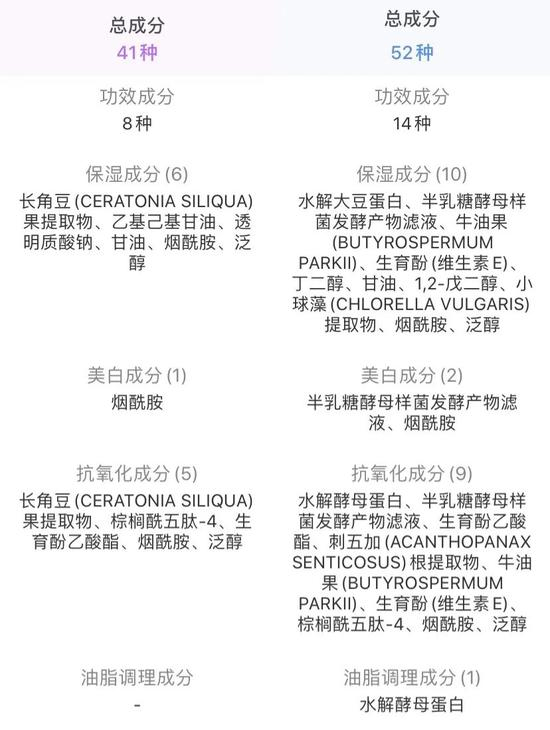 两款产品的核心成分提取纯度会有一定差异,但功效成分选择类似;使用感方面仅仅有细微的差别。