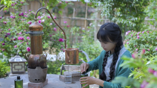 生活在田园乡村的李子柒经常会自己亲自动手种植一些果蔬花卉。花果成熟时把它们摘下,用来烹饪、装饰甚至还准备了蒸馏用具来自制花朵纯露保养皮肤。