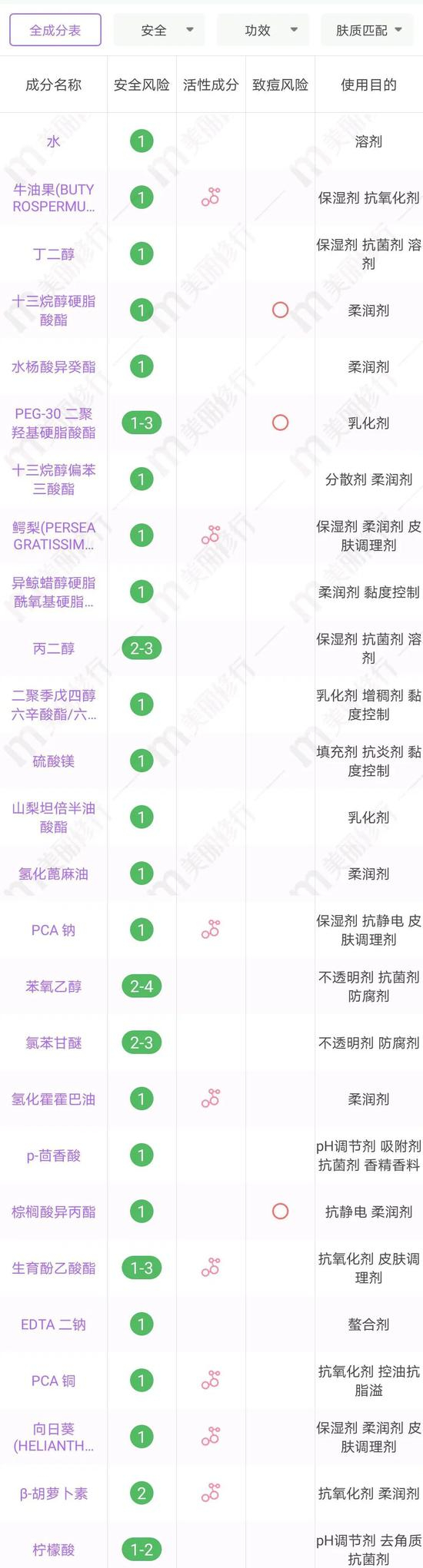 成分起着保湿效果的主要是牛油果树酯和鳄梨油,前者含有丰富的不饱和脂肪酸,后者则可以帮助护肤品渗透,它俩配合起来有不错的保湿滋润和修护效果。