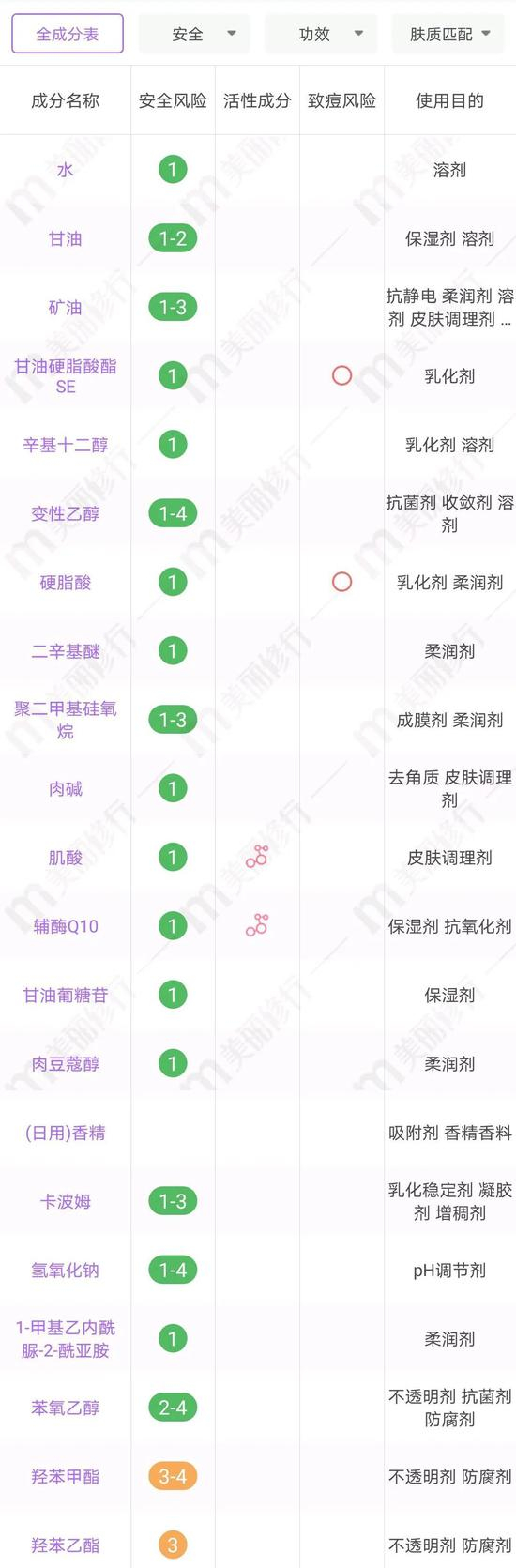 Q10是人体内的一种天然成分,可以为肌肤提供充足能量,是一种很好的抗老成分。添加的VC衍生物除了改善暗沉也有一定的抗氧化效果。最后,甘油加矿物油的组合提供了不错的保湿性,整体配方还挺完整的。