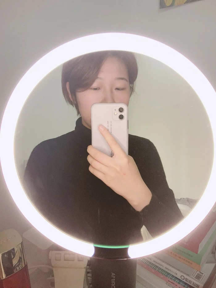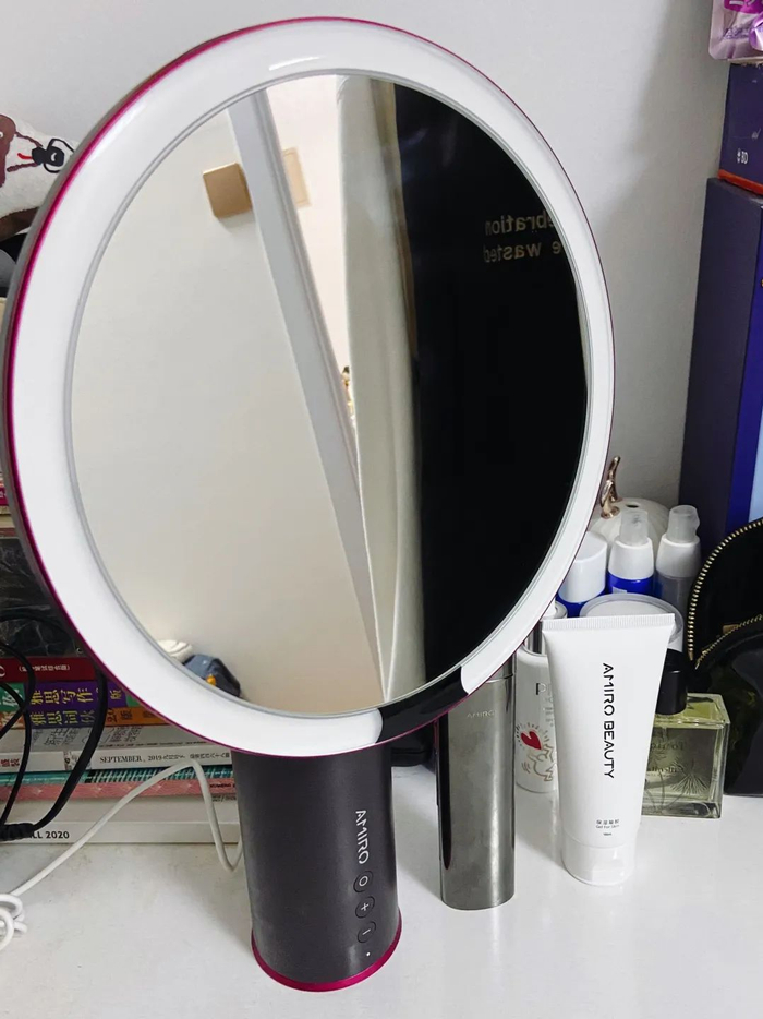 本来觉得镜子差别都不会特别大,但它自带的这个圈灯真的绝了。大多数情况下家里的自然光并没有那么均匀,而化妆在一定程度上就是个调整光影的过程,光照条件不好真的很影响技术的发挥。第一次用这个镜子化妆的时候,有一种打开新世界大门的感觉,脸上的各种细节一览无余,哪里需要提亮、哪里需要压暗也会更加明确,能精准把握细节。灯光有偏冷/偏暖两种,亮度也可以自行调节,小仙女们的家中必备!