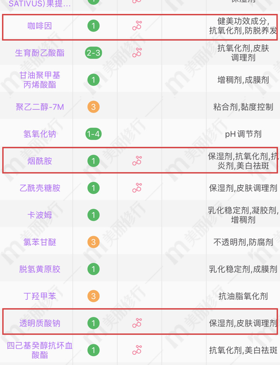 至于我的核心成分,说出来大家就明白了,烟酰胺、咖啡因和透明质酸,兼顾了提亮、消肿和保湿,是不是还不错?