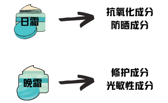 而到了晚上的黄金修护时间,晚霜自然是要给肌肤加把劲,该补的补上,该修的修好,于是很多功效性成分就会放在晚霜中,还有一些具有光敏性(视黄醇等)白天无法使用的成分,晚上也能正常发挥它的作用。
