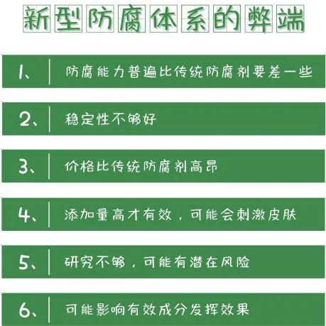 在介绍上面这些新型防腐体系的时候,小编已经提到了一些它们的弊端,比如这些防腐替代物的防腐能力普遍比传统防腐剂要差一些、稳定性不够好,对包材和配方的要求高、相比传统防腐剂价格更加高昂,没有商业价值、高添加量才有效,可能因此会对皮肤产生刺激等。