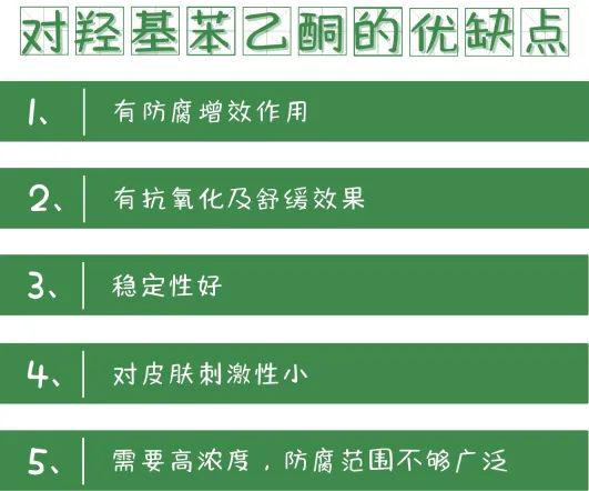 这类成分中对羟基苯乙酮必须拥有姓名,它除了可以作为传统防腐剂的替代品,具有防腐增效的作用,还具有抗氧化和舒缓的作用,而且稳定性好,对皮肤的刺激性极小。但单独使用对浓度的要求比较高,而且防腐范围不够广泛,所以需要搭配其他防腐剂使用。
