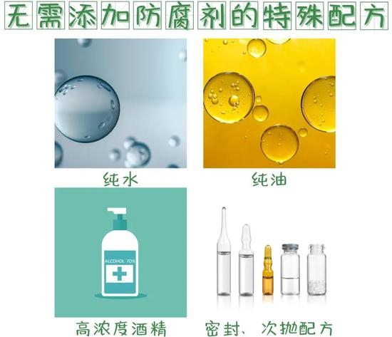 比如纯水、纯油以及含有20%以上酒精的配方的护肤品就无须添加防腐剂,主要因为纯水中不含有有机物,纯油自身就具有防腐能力,而高浓度酒精也具有防腐作用,所以温泉水喷雾、护肤油、精油类产品一般不需要添加防腐剂。另外经过严格杀菌的密封包装及次抛配方也可以不添加防腐剂。