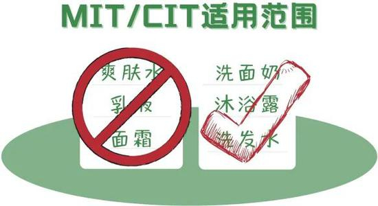 MIT是甲基异噻唑啉酮的简称,CIT是甲基氯异噻唑啉酮的简称,这两者通常复配使用,复配使用的防腐剂成为被称为卡松。对于这类防腐剂,有研究证明它们与接触性过敏和接触性皮炎有关联,所以法律已经规定不允许在驻留类化妆品中使用。