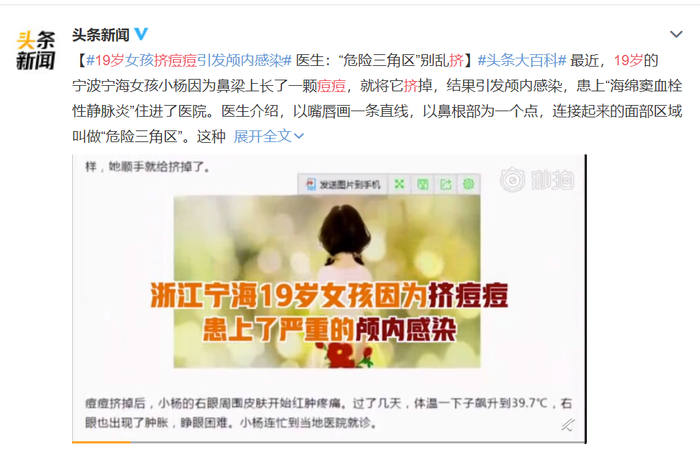 因为不专业和不卫生的挤压清理,轻则留疤,重则感染。尤其是面部的“危险三角区”,更是要在下手前三思而后行!(虽然真的很酸爽。。。。。。)
