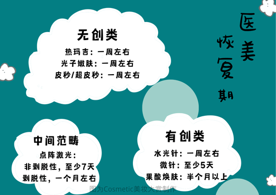 我列举了一些市面上常见的医美项目,大家可以看看恢复时间,但这不是绝对的,具体还是要看个人体质和做的程度,仅供参考哦(勿杠)~