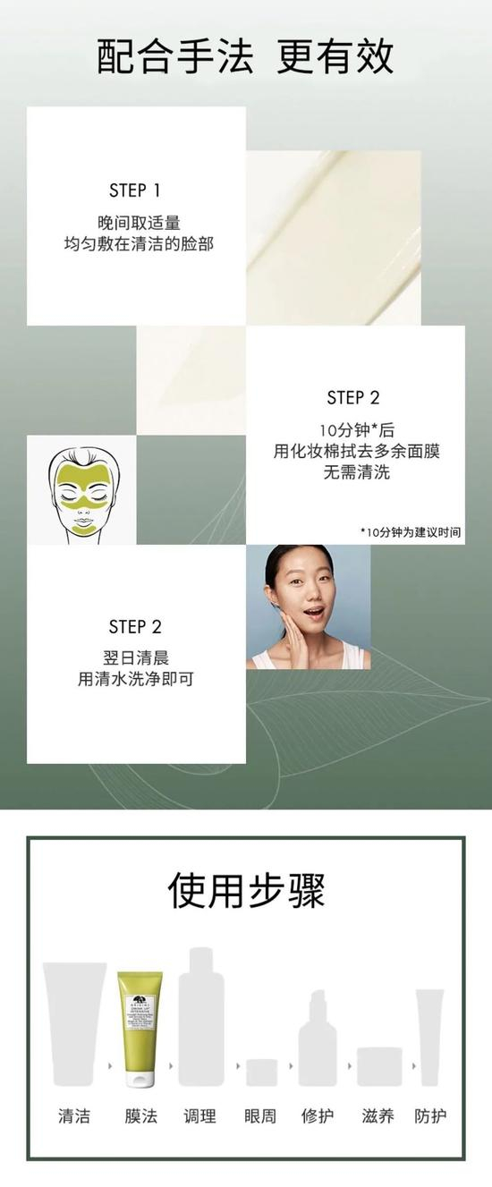 晚间护肤后,在脸上及颈上涂上足够份量的面膜,轻轻按摩,整晚敷用。