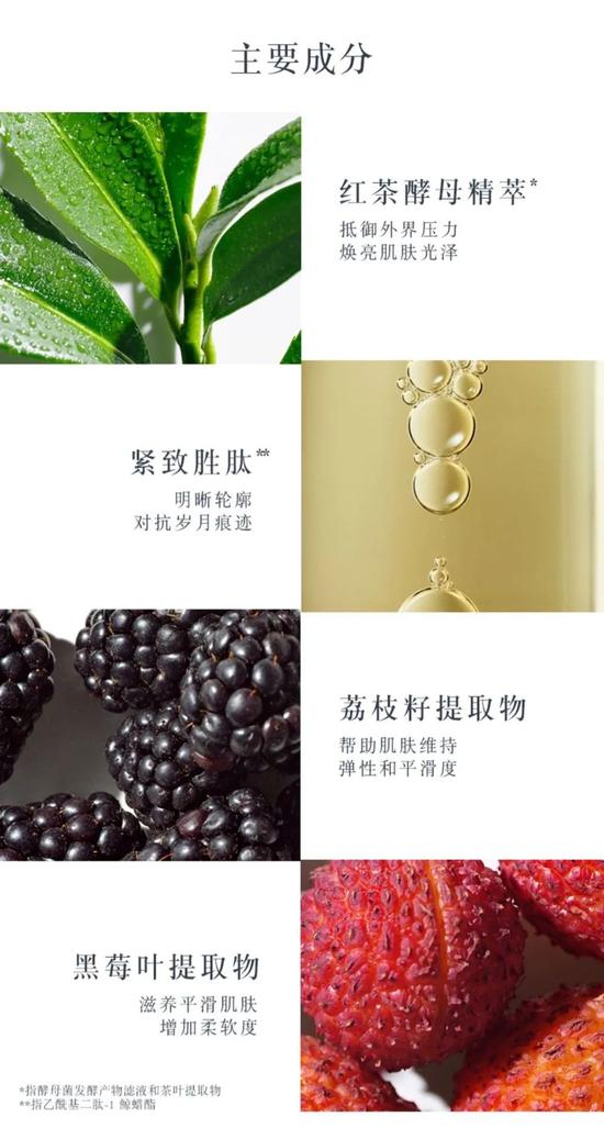 内含紧致胜肽,可以有效紧致提升,达到明晰轮廓线条的效果。同时黑莓叶和荔枝籽的提取物,也能帮助缔造柔软弹性的平滑肌肤。