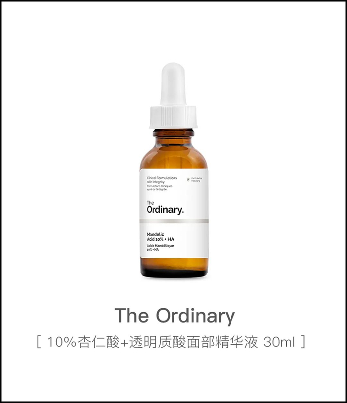 不用O姐多说,The Ordinary可是刷酸届的王牌选手了!杏仁酸是一个亲油皮的温和酸类,10%的黄金浓度既高效又温和,可以去除老废角质、疏通毛孔阻塞、使肌肤细致平滑。成分中的透明质酸可是保湿界的明星成分,帮助刷酸后改善肌肤缺水问题,真的不要太贴心!