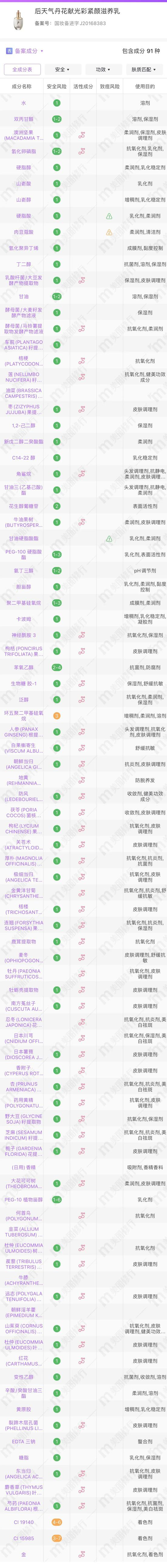 跟前面两位比起来,这91种成分看起来就有点眼花缭乱了,更别说其中一半都是植物提取物。天气丹系列主打的是抗氧化的人参根和提亮去黄的鹿茸,虽然每种植物成分的添加量不算很多,但是它家胜在原料以及搭配,长期使用的话,抗老能力还是值得期待的。