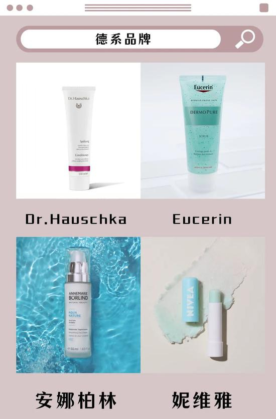 德系护肤品牌相比起前面几个国家来说,就比较小众了,不过其中也不乏妮维雅、安娜柏林、Dr.Hauschka这些比较知名或者近几年出现在大众视野中的牌子。