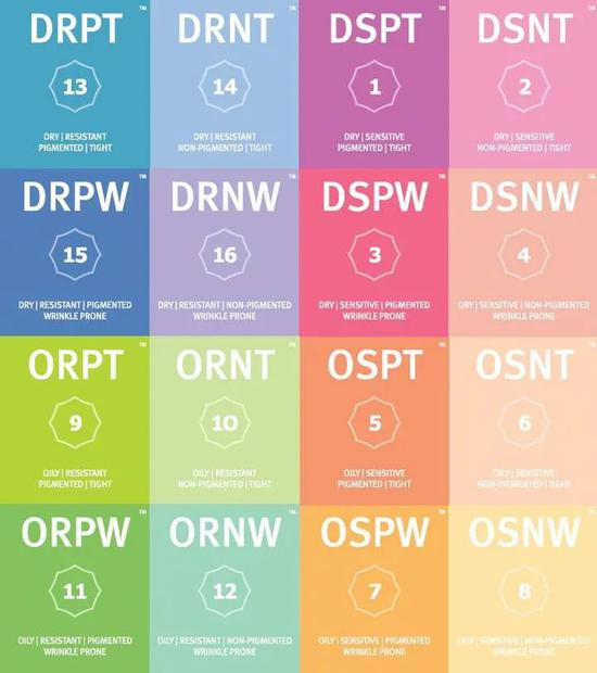 目前非常广泛使用的皮肤类型分类是由美国著名皮肤医生褒曼所著的《The Skin Type Solution》,根据四组类型,组合成16种不同的皮肤类型。