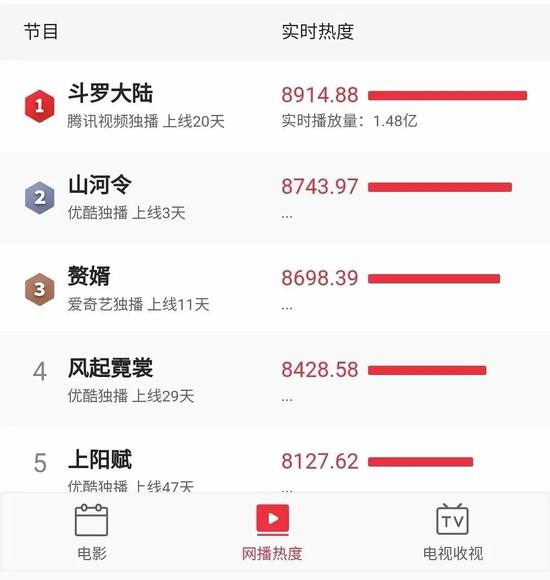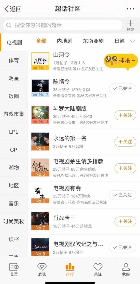 而最近的国产剧黑马则是《山河令》,上线三天,超话已经占据电视剧榜第一,实时热度已经冲到全网第二,仅次于上线已20天的《斗罗大陆》,俨然有了大爆剧的雏形!