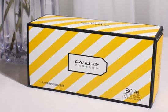 三利这款洗脸巾的包装和棉上除了颜色以外其他基本差不多。相比较而言,它的外层插口没有棉上的深,用完合上的时候不太牢固。