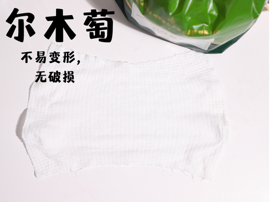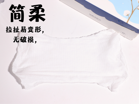 简柔和棉上本身就比较柔软,吸水之后,只稍稍一拉就会变形。从图中也可以看到,它们已经快要从长方形变成“骨头形”惹!但即使被拉成这样,也没有破损,总体来说还不错。