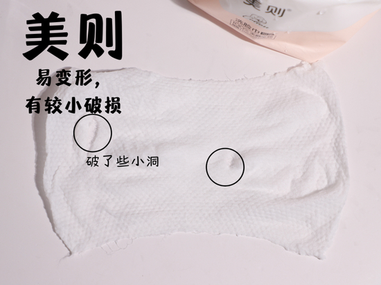 但是美则就败下阵来了,不止撕口处絮很多,贴在脸上让我觉得它很松散,使用感不太好。三利虽然摸起来比较硬,但上脸并没有不舒服的感觉,和棉上、简柔和妮卡这些用起来没有明显的差异,亲肤效果平平。