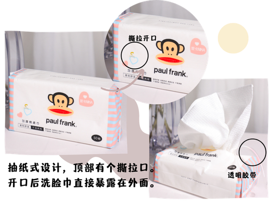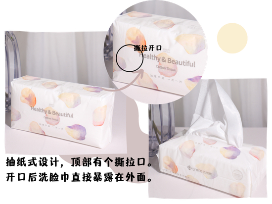 第一款就是洁丽雅了,它完全属于抽纸式设计,顶部开口,然后从中抽取洗脸巾即可。我觉得吧,这个操作的确很方便,但是抽取前一张会把后一张带出来还是问题所在,洗脸巾会直接暴露在外面。所以,如果看上了这款洗脸巾,千万别把它放在卫生间这些比较潮湿的地方哟~