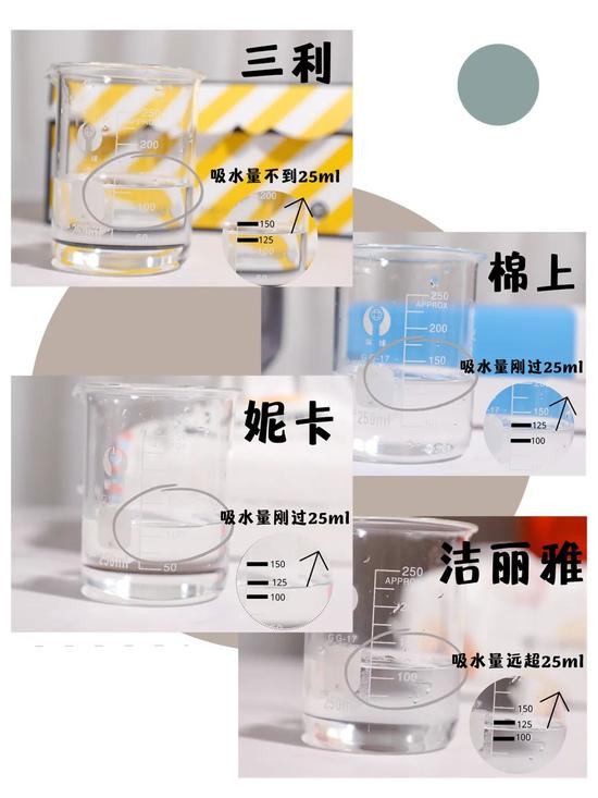 其中,棉上和妮卡吸水量大致大致相当,三利吸水量不到25毫升,而洁丽雅快要接近50毫升惹~25毫升小分队里,洁丽雅赢得妥妥的!