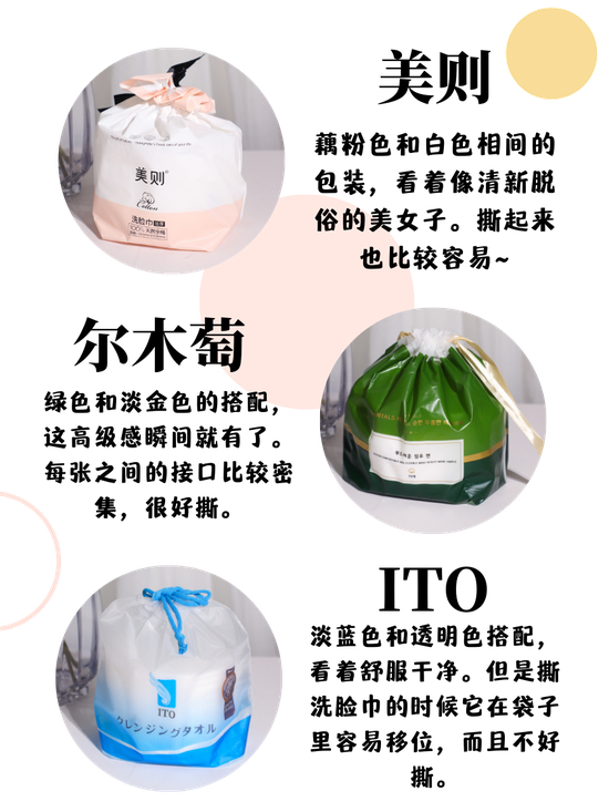 说到这,小伙伴们是不是放心许多?那跟我一起来瞅瞅今天的洗脸巾测评吧~老样子,合照先上暖暖场子。想知道有各位富婆们用过的款嘛~