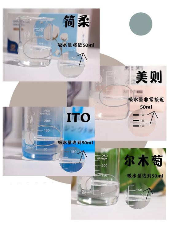 我在做吸水性试验的过程中发现,这8款刚好是4款一组站好了队:一组吸水量在25毫升徘徊,一组在50毫升徘徊。我们来具体康康~
