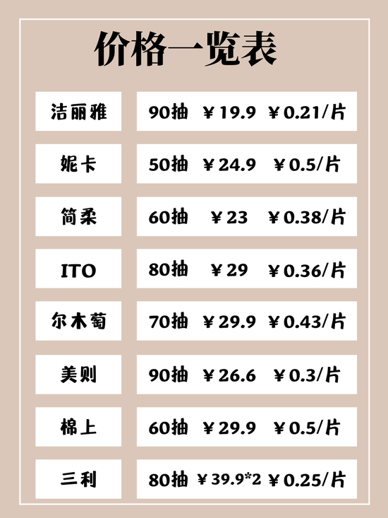 关注洗脸巾这种一次性消耗品价格的筒子不在少数吧~于是乎,俺就顺势整理了张洗脸巾单片价格一览表(请叫我贴心7)。8款里最便宜的要数洁丽雅,不要告诉我都要入手它哈哈!其次是三利、美则。其实总体性价比都还不错,洗脸巾真没想象中那么费钱~