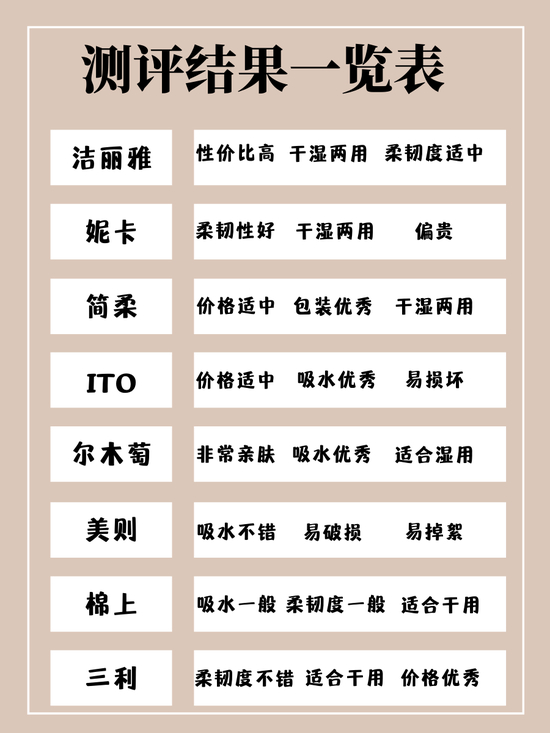 好啦,今天8款洗脸巾的角逐就到这里惹,筒子们看下来有没有get(收获)到自己喜欢的品牌哩?这里再来给大家做个小总结。