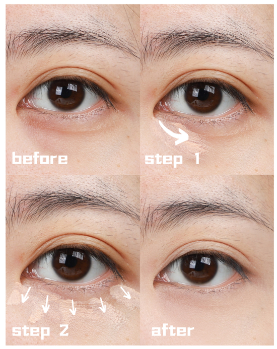 那如何用它来完美遮盖黑眼圈呢?首先,大噶要知道青色的对立色是橘色,所以我们要先用IPSA中间这块偏橘调的颜色,涂抹在眼角下最深的地方,让它先中和掉底下的青色。再用最浅色的遮瑕点涂,从上向下的均匀推开,基本黑眼圈就能被遮得七七八八了~