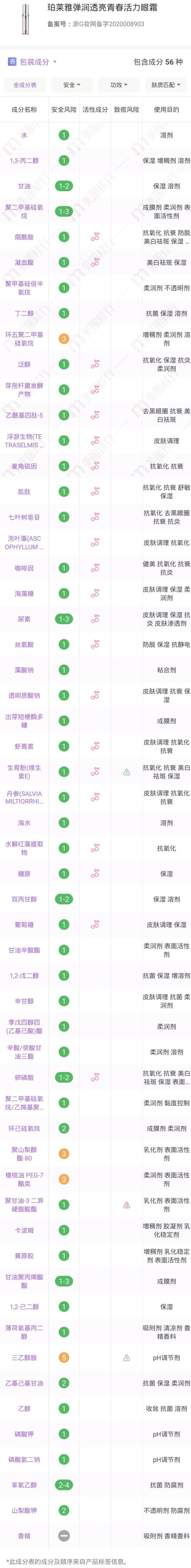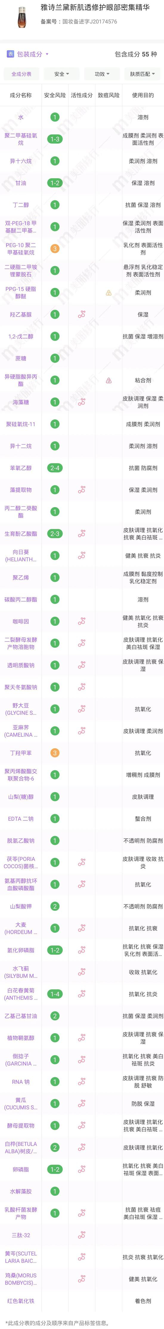我仔细去扒了扒众多眼霜的成分,发现其中的保湿成分、植物提取物起着主导作用,改善眼周肌肤的干燥缺水,另一边加上抗老成分的加持,又可以发挥着预防和淡化纹路的双重支持。相比于眼霜来说,眼部精华添加的抗氧化活性成分更多,浓度也更高,自然淡化纹路和改善暗沉的能力更出色~