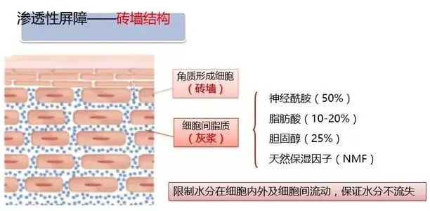 1、 刚刚说到因为过度水合导致角质细胞之间变得疏松,这中间有一个非常重要的物质叫“脂质”,它的作用就是限制水分在细胞内外和细胞间的流动,让水分不丢失,所以是非常重要的屏障功能。