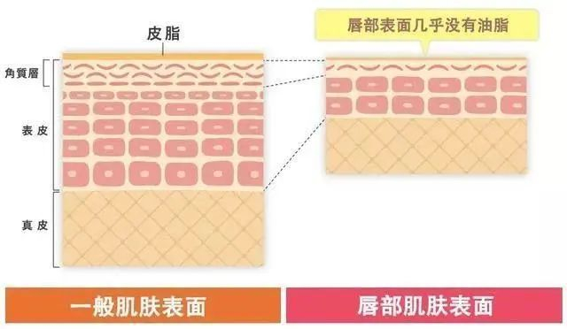 首先我们脸上皮肤角质层最薄的地方就是眼部和唇部。按照我们上面所说的皮肤屏障来说,脂质是非常重要的,而我们的唇部肌肤没有能分泌油脂的皮脂腺。