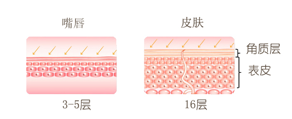 由于唇部缺少皮脂腺和皮脂膜的保护,因此唇部皮肤水分流失速度是面部皮肤的三倍,更容易干燥,更容易出现废旧角质及死皮。