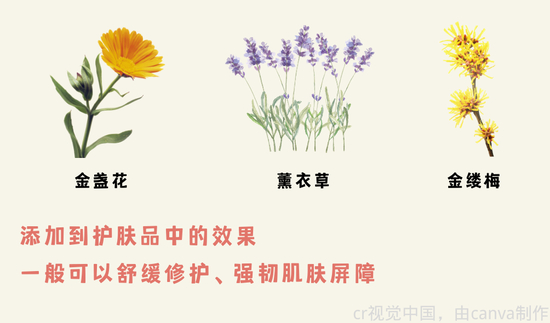 小可爱们熟悉的金盏花、薰衣草、金缕梅提取物一般会起到舒缓、修护脆弱的脸蛋,维稳肌肤状态的作用。在许多能强韧肌肤屏障肤的护肤品中都有它们的汗马功劳。