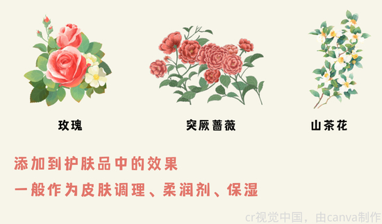 玫瑰、蔷薇、山茶花这些花类提取物大多数情况下比较适用于干燥肌,在不少补水的产品里都可以看到它们的存在。
