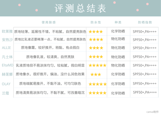 小编掰扯了这么多,最后还是给这八款防晒简单地总结一下吧,让姐妹们更直观地进行比较选择。
