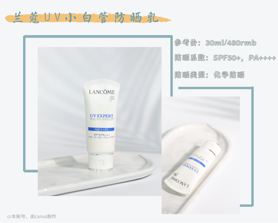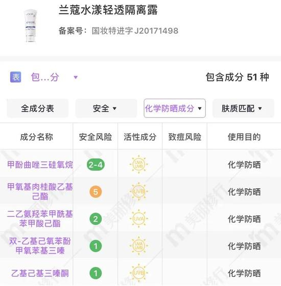 同为化学防晒的兰蔻UV小白管值得一提的成分是双-乙基己氧苯酚甲氧苯基三嗪,作为新型的广谱防晒剂可以防护不同波段的紫外线,分子量大,不易被肌肤吸收,还可以作为其它化学防晒剂的稳定剂。