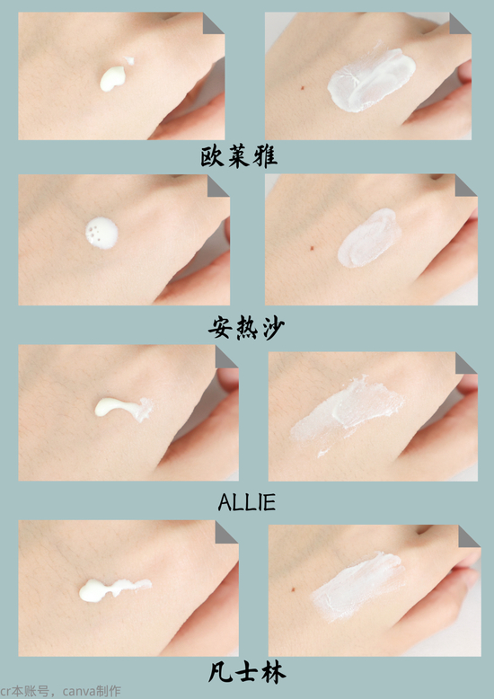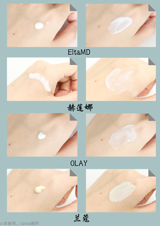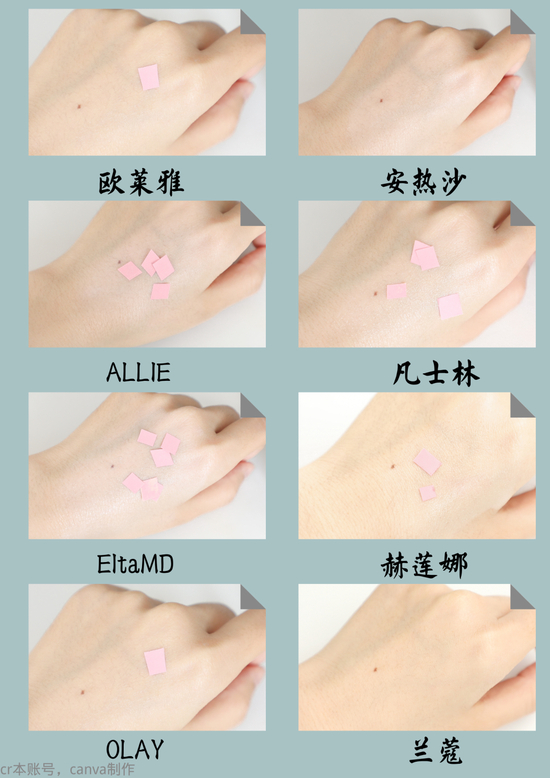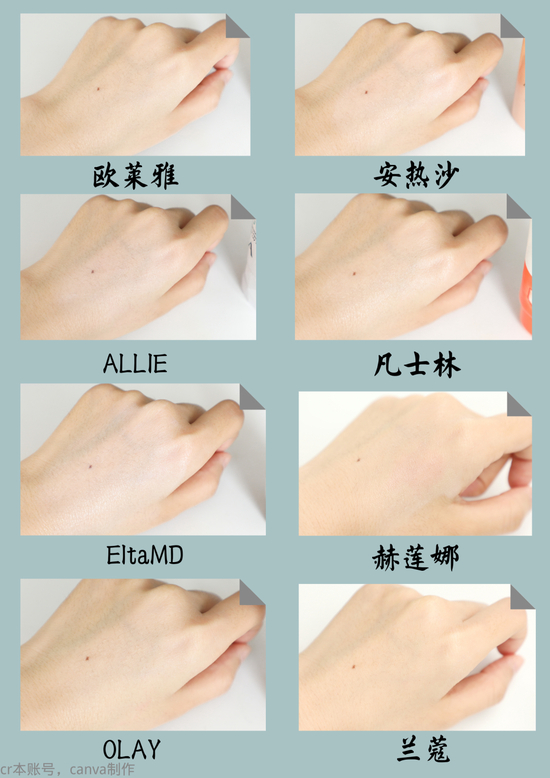 从图片来看介意假白的姐妹可以避开ALLIE和EltaMD这两款了,小编搓半天都搓不匀这个颜色。赫莲娜、OLAY、兰蔻抹开很快就与肤色融为一体,没有什么润色效果。欧莱雅、安热沙和凡士林既提亮了肤色还很自然,可以掩盖一些暗沉,追求均匀肤色的姐妹可以冲啦!