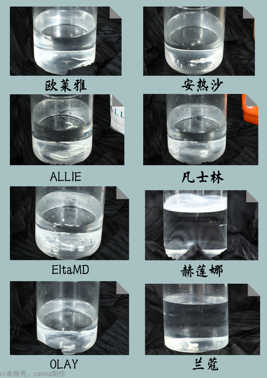 不难看出,赫莲娜溶水性很强,可能是由于质地偏稀,小编刚挤进去便迅速与水融为一体。剩余的七款都不怎么溶水,没有让纯净水变得浑浊。姐妹们就按照自己喜好来选择啦~